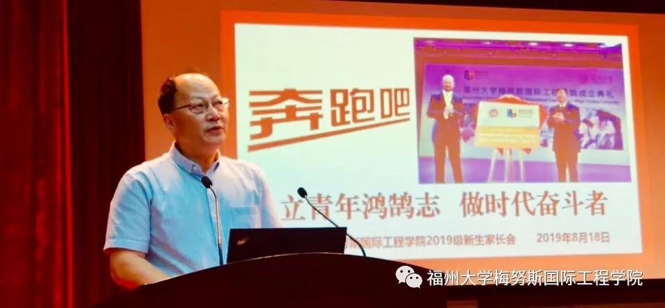 林瑞全副院长代表学院对新生家长们的到来表示热烈欢迎,他表示,全体新生和家长们的选择与信任对于学院既是一份莫大的荣幸也是一种无形的鞭策,深感使命在肩,责任重大!他详细回顾了学院的创建历程和重要历史时刻,介绍了各专业培养目标、课程特色和就业前景,着重展示了学院在日常教学、质量体系、激励体系、毕业生多样化选择等方面的特色优势;并以“志愿生源充足、投档分数线高、接近福州大学”为切入点介绍了学院2019年首次高考招生录取情况。最后,林瑞全副院长重温了福州大学校长付贤智院士在学院成立典礼致辞中提出的三点希望“努力将学院办成最具吸引力的中外合作办学机构、最具潜力的国际化人才培养基地、最具活力的沟通交流平台”,表示学院一定将不忘初心、久久为功!