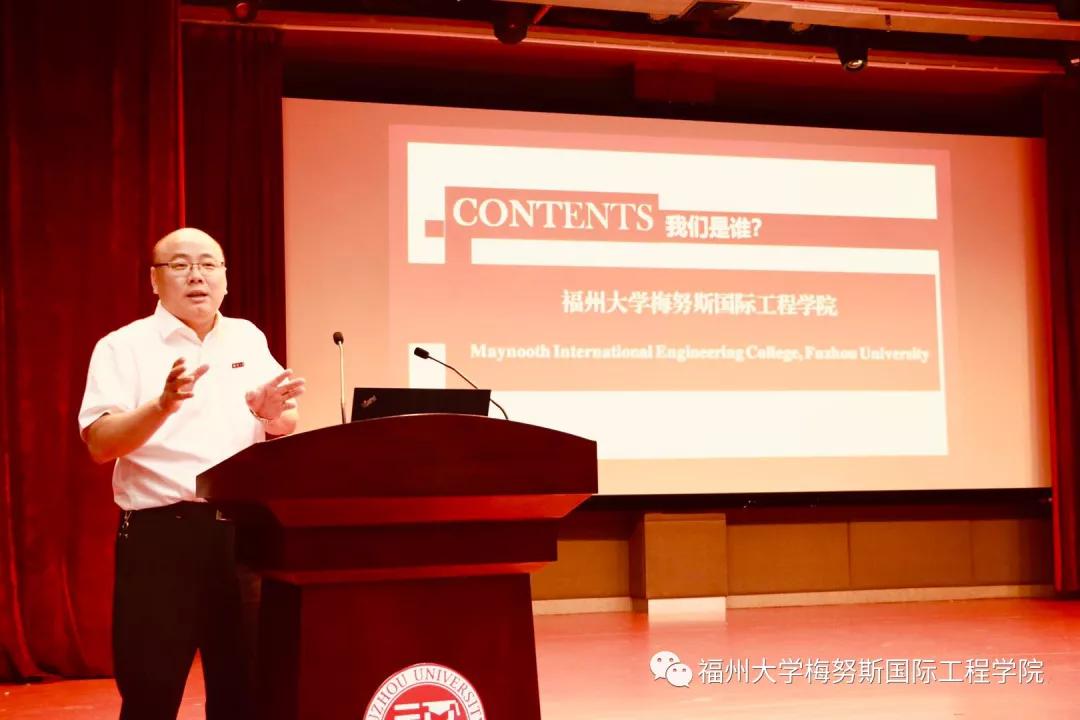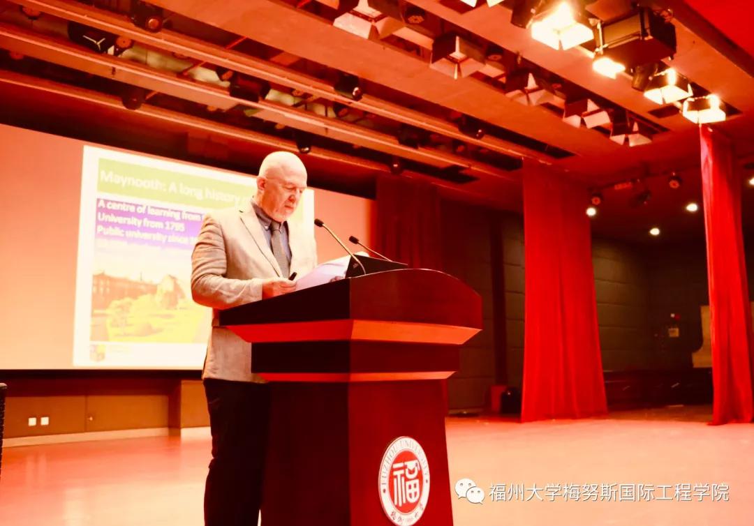 Ronan·Reilly副校长代表爱尔兰国立梅努斯大学发表了热情洋溢的致辞,对见证福州大学梅努斯国际学院的诞生表示荣幸,认为学院的未来发展不可限量。他向全体家长介绍了爱尔兰的国情,强调其在IT科技领域取得的卓越成绩,认为这与学院所开设专业高度契合,将为学生提供大量优质的实习机会与绝佳的就业前景。并从历史沿革、国际声誉、质量保障、交流及深造渠道、师资力量等方面全面展示了爱尔兰国立梅努斯大学所拥有的不俗实力,相信学院将为学生提供独特的教育体验,培养他们具备融入未来经济社会所需的批判性思维和专业能力。
