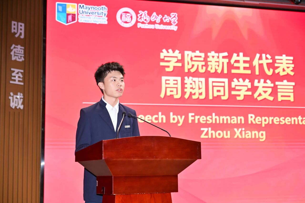 站在新起点,迈向新征程。福州大学党委常委、副校长、梅努斯学院院长杨黄浩教授代表全校师生,对 2025 级全体新生加入梅努斯学院表示欢迎,同时向新生们介绍了学院的发展过往与取得的突出成就。杨校长也对全体新生提出了三点期望:一是,踔厉奋发,以鸿鹄之志勇担时代使命;二是,笃学不倦,以求知若渴之态攀登知识高峰;三是,全面发展,以多元之能绽放青春光彩。“生逢盛世当不负盛世,生逢其时当奋斗其时”,愿全体新生紧握时代接力棒,传承福大 “三种精神”,以乘风破浪之姿奋力奔跑,在未来四年大学生涯中,书写独属于自己的精彩人生篇章!