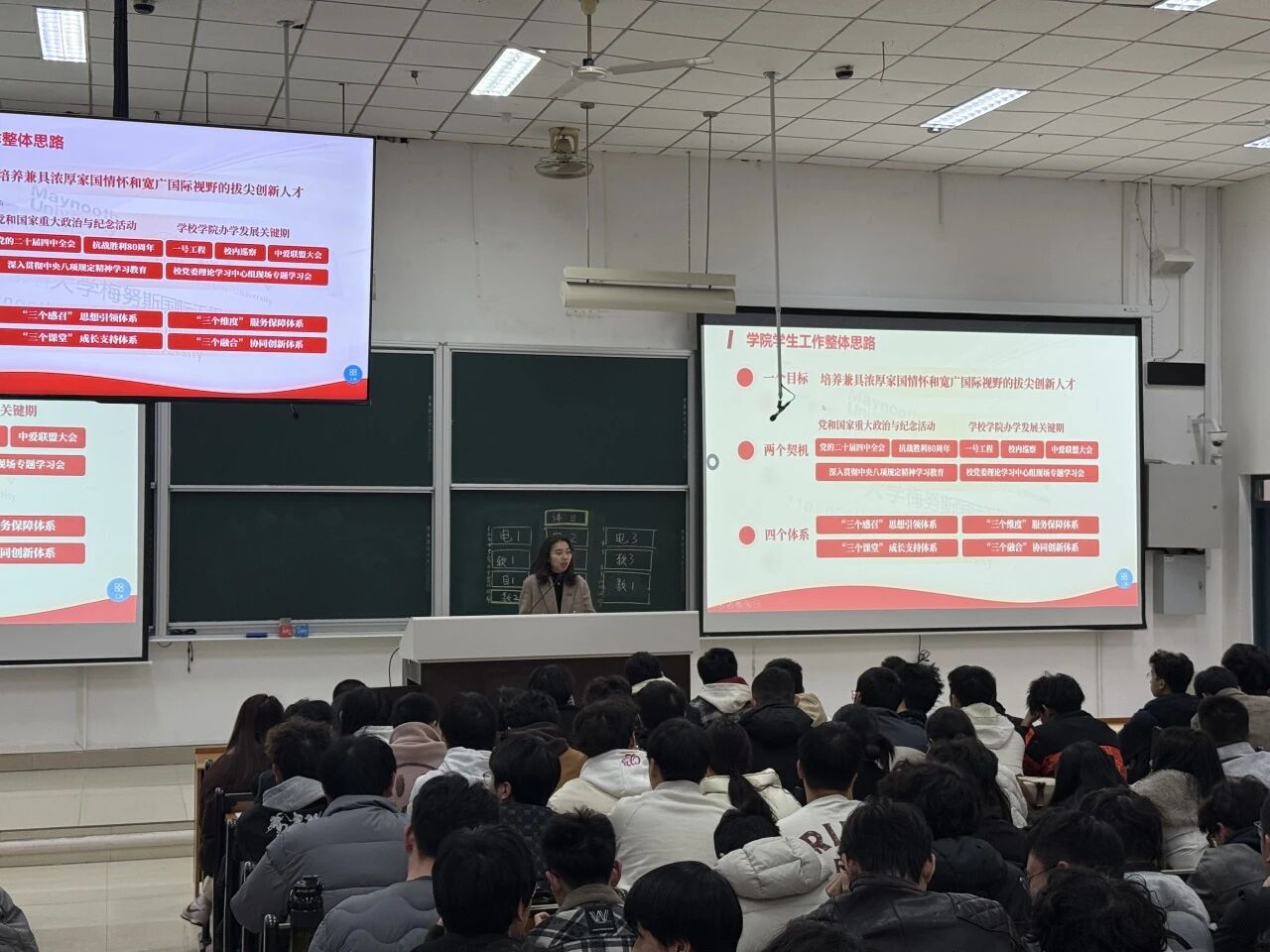 王涛副书记重点解读了学院“四个体系”育人格局的核心内涵,系统梳理了学院在党建引领、人才培养、国际交流、科研创新等方面取得的显著成就,并明确了新学期学院育人工作的重点规划。她指出,学院始终以“培养兼具浓厚家国情怀与宽广国际视野的拔尖创新人才”为目标,依托“四个体系”育人格局,整合优质教育资源,在专业建设上持续发力,助力电子工程等特色专业提质增效;在国际合作上不断深化,拓展海外名校访学、联合培养等交流渠道,为学子搭建多元化成长平台。