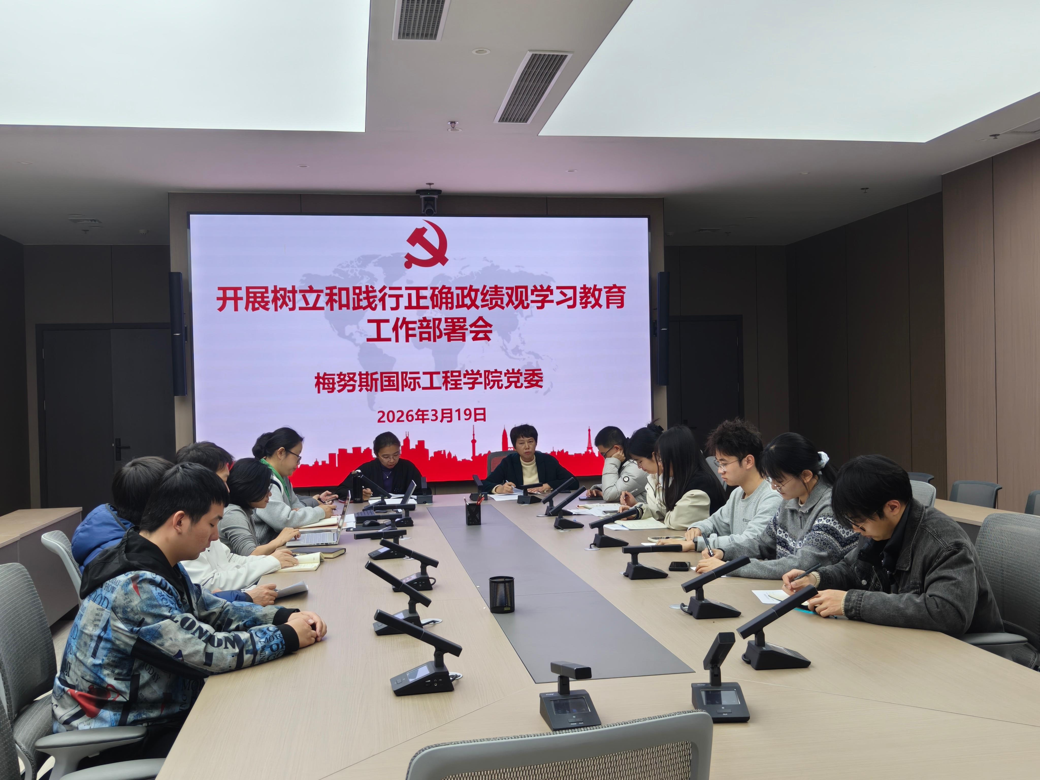 党委开展树立和践行正确政绩观学习教育工作方案》,并成立学习教育工作领导小组及下设机构,研究部署了学院开展树立和践行正确政绩观学习教育工作,强调要紧密结合中外合作办学实际,引导党员干部以实干担当践行正确政绩观,为学院“十五五”开局起步和高质量发展提供坚强政治保障。
