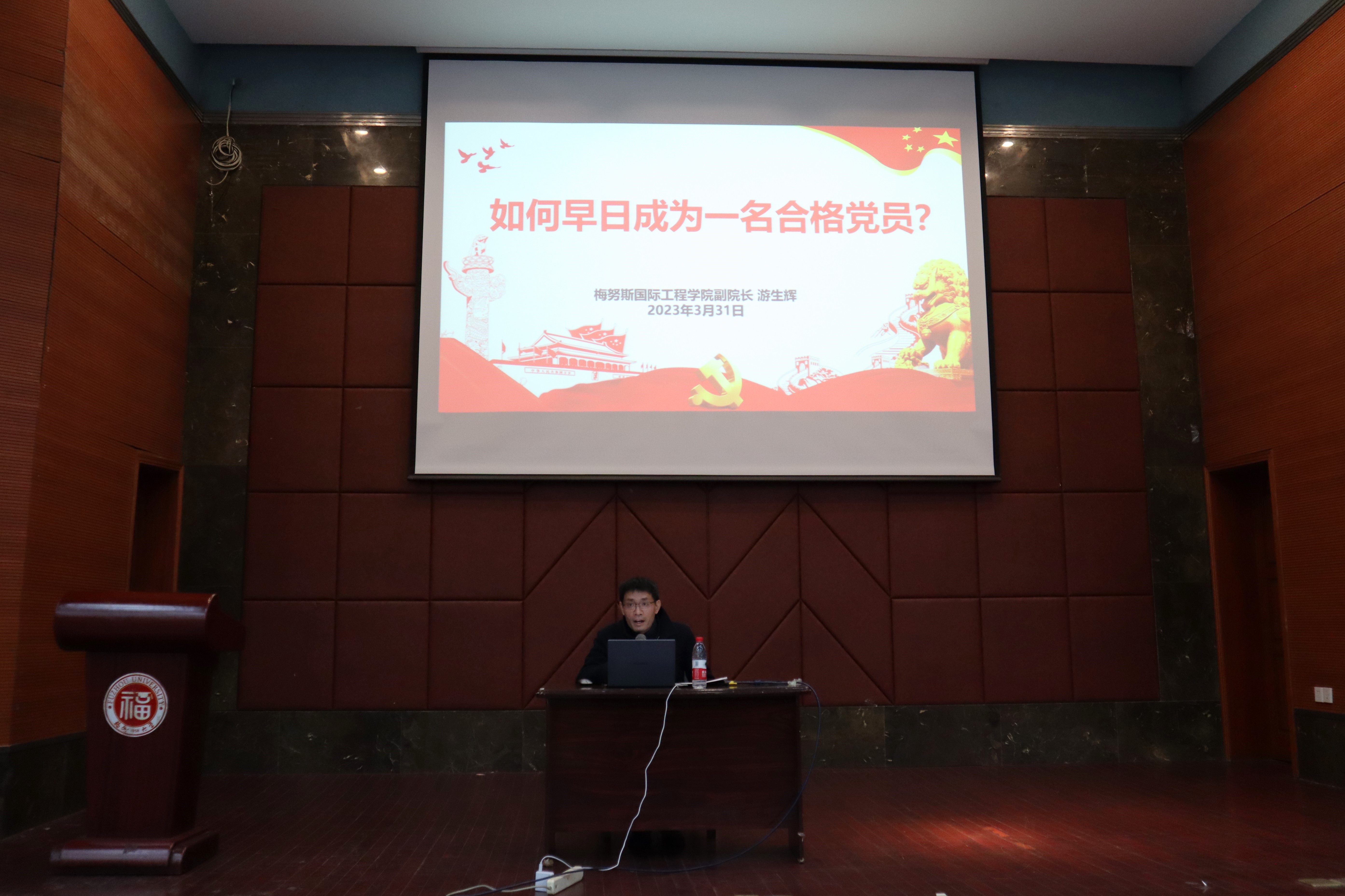 游生辉老师还重点介绍了福州大学发展党员的工作流程,从思想,学习,学生工作以及生活四个方面阐释了怎样才能成为一名合格的党员:一是要思想上拥护党的领导,积极参加理论学习,向党组织靠拢;二是以踏实的学习态度扎实打好专业基础,练就过硬本领,锐意进取,永不自满;三是要勤勤恳恳地做好学生工作,自觉为同学们服务,做实事;四是在生活中要真诚待人,为人正直,有良好的群众基础。