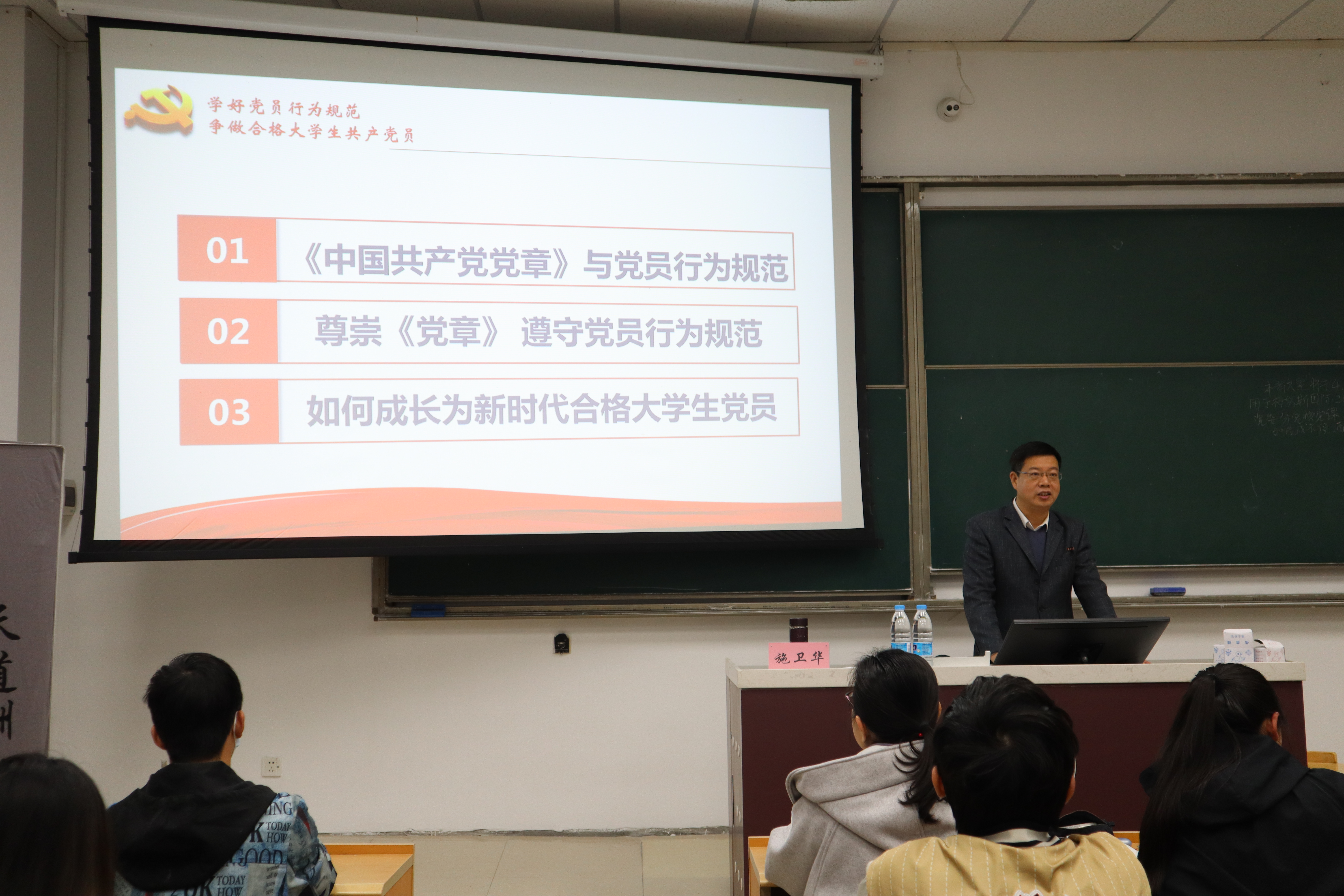 施卫华老师首先立足党的二十大,强调了坚持制度治党、依规治党,以党章为根本,以民主集中制为核心,完善党内法规制度体系的重要意义。施老师殷切寄语学员们要自觉学习党章、遵守党章、贯彻党章、维护党章,为全面建设社会主义现代化国家、全面推进中华民族伟大复兴而团结奋斗!