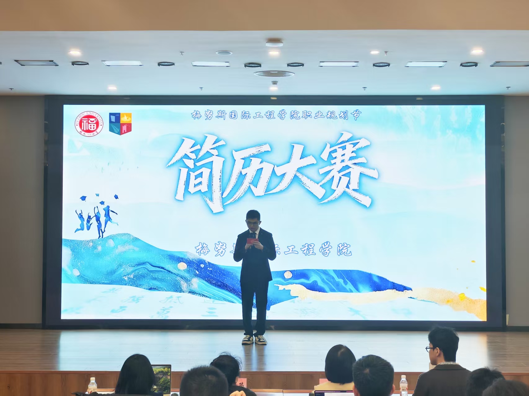 于 11 月 14 日在晋江楼一楼报告厅举办简历制作大赛决赛。活动邀请到福州大学生涯规划与就业指导工作室负责人汪静筠老师、中国职业规划师程婷女士及博思软件校招负责人刘文震先生担任评委。院团委书记刘歆一老师在现场,为参赛选手加油鼓劲,与近百名学生共同见证赛事亮点。